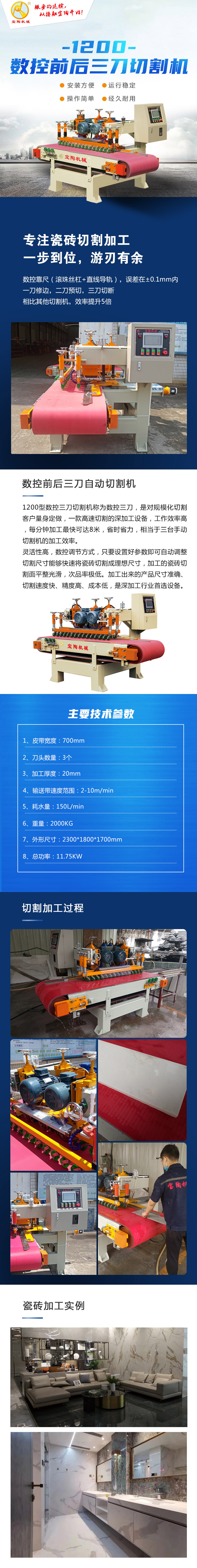 1200型數(shù)控前后三組刀切割機俗稱為數(shù)控三組刀,是對規(guī)模化切割客戶量身定做,一款高速切割的深加工設(shè)備。最大可切割1.2米(1.2米瓷磚可對開成1200*600mm);有輸送帶流水線式自動批量切割,切割速度快;采用數(shù)控調(diào)節(jié)尺寸,精度高,誤差在0.1mm以內(nèi);采用三刀頭結(jié)構(gòu),不崩邊,切割帶修邊一次性過,直接切割出原廠邊效果,無需二次加工,更省事;效率是手推切割機的4倍。適合大批量瓷磚切割加工。